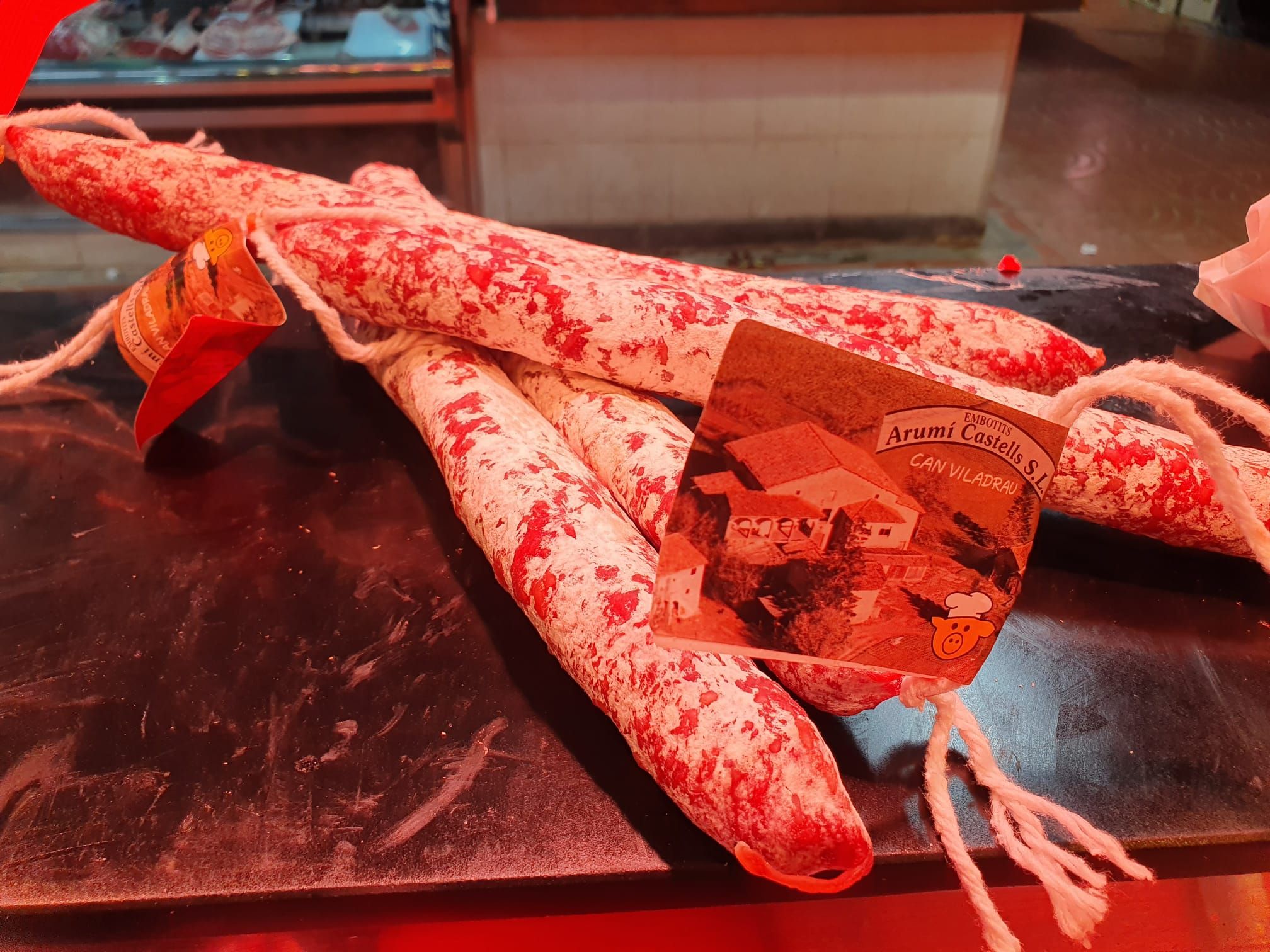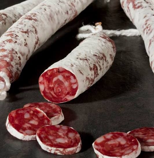 Fabricat artesanalment amb ingredients de primera qualitat de porc. Cuixa, espatlla, cansalada virada, sal, pebre i condiments conservadors. Tripa natural